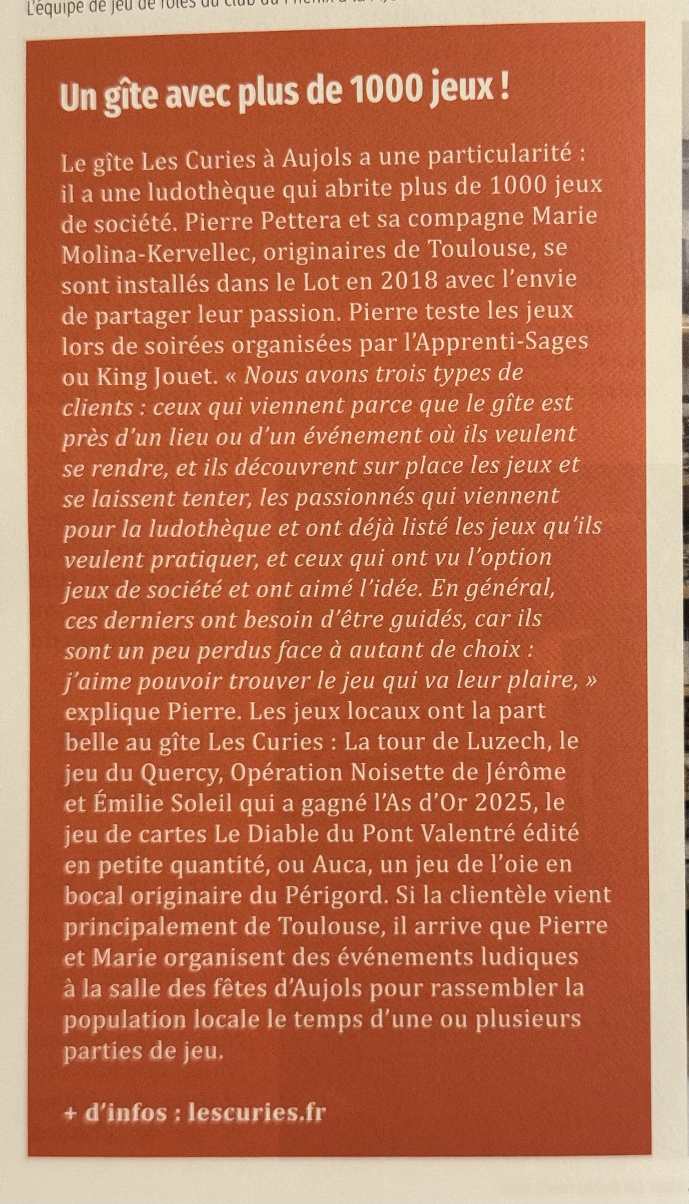 Le Ludogîte des Curies a été salué par plusieurs revues et médias, qui ont été séduits par son concept unique alliant confort, convivialité et ludisme. Son ambiance chaleureuse et son offre originale, idéale pour les familles et les amis en quête de détente et de jeux, en font une destination incontournable. Découvrez pourquoi le Ludogîte séduit tant à Cahors et Saint-Cirq-Lapopie.